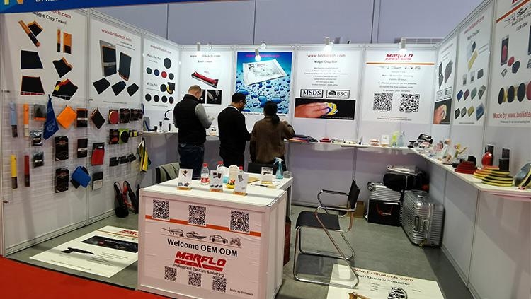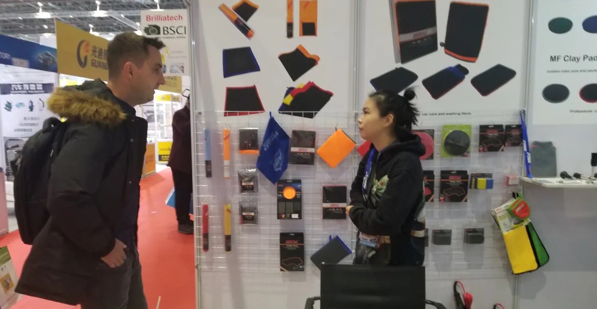 Automechanika ShangHai our booth for magic clay mitt towel, it was a new item. every year for Automechanika ShangHai, we have about 3 new product. this year, the magic clay mitt with cuff, it is hot item for the international customers. you can see UK, PL, SP, GM ..... our magic clay mitt around the world. that starts from 2015, our magic clay mitt is hot items in Automechanika ShangHai customer like it very much.
